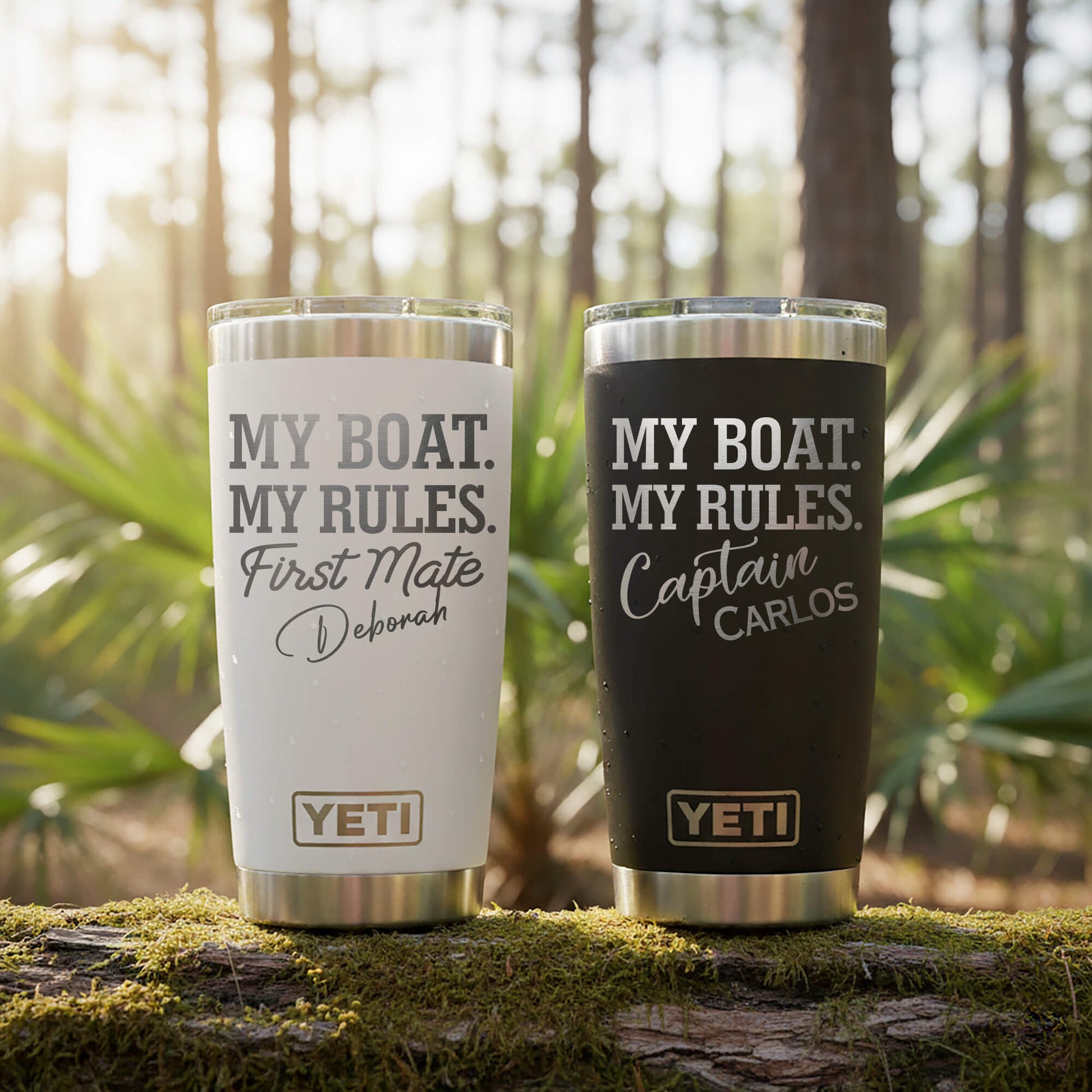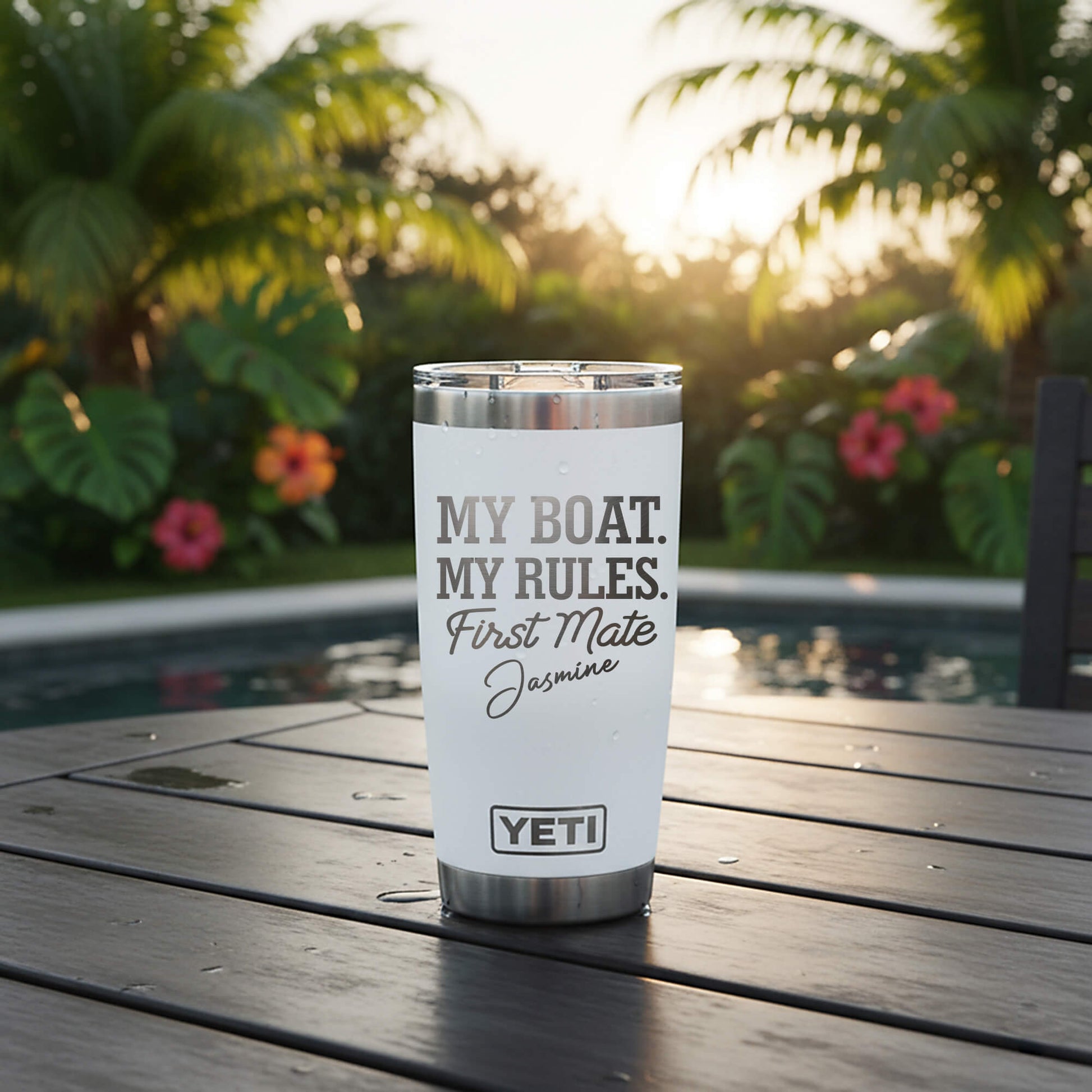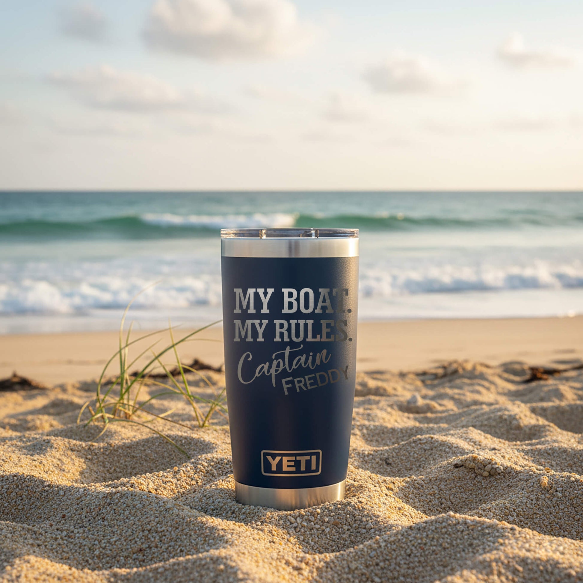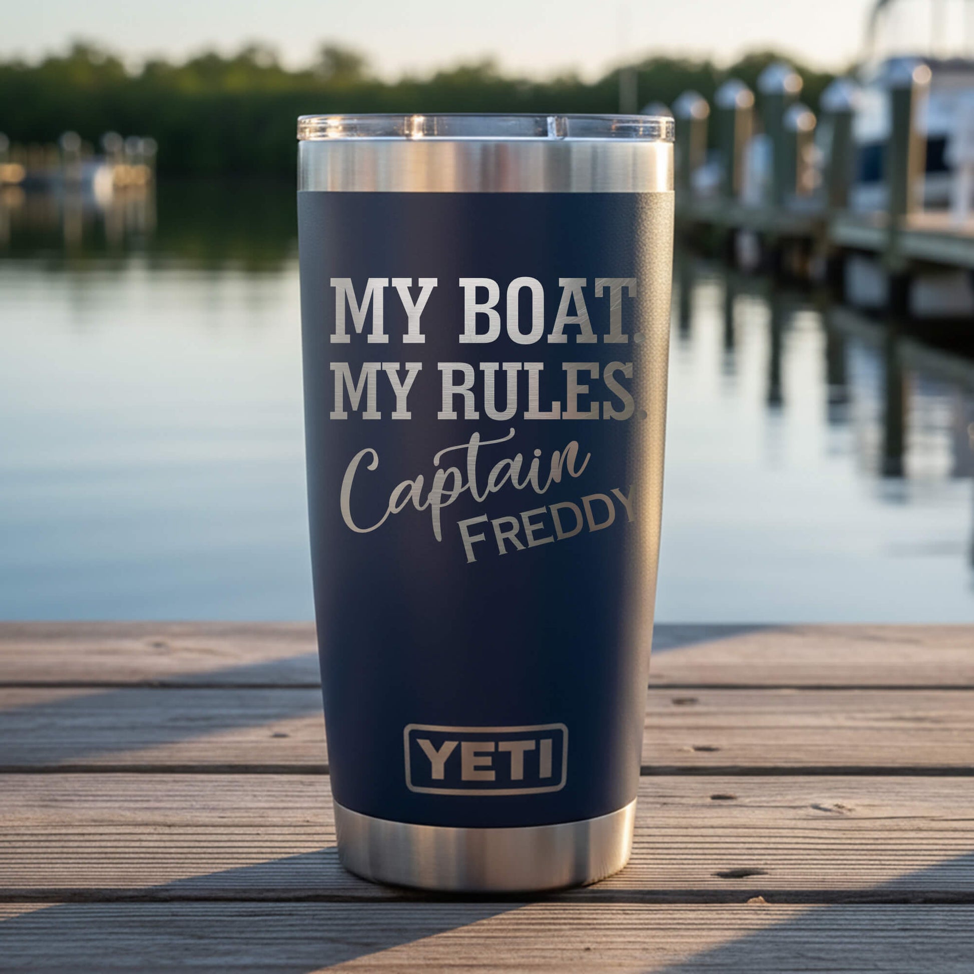 Take command of the seas (and your drinks) with this Custom Engraved 20oz Yeti Tumbler – “My Boat, My Rules.”