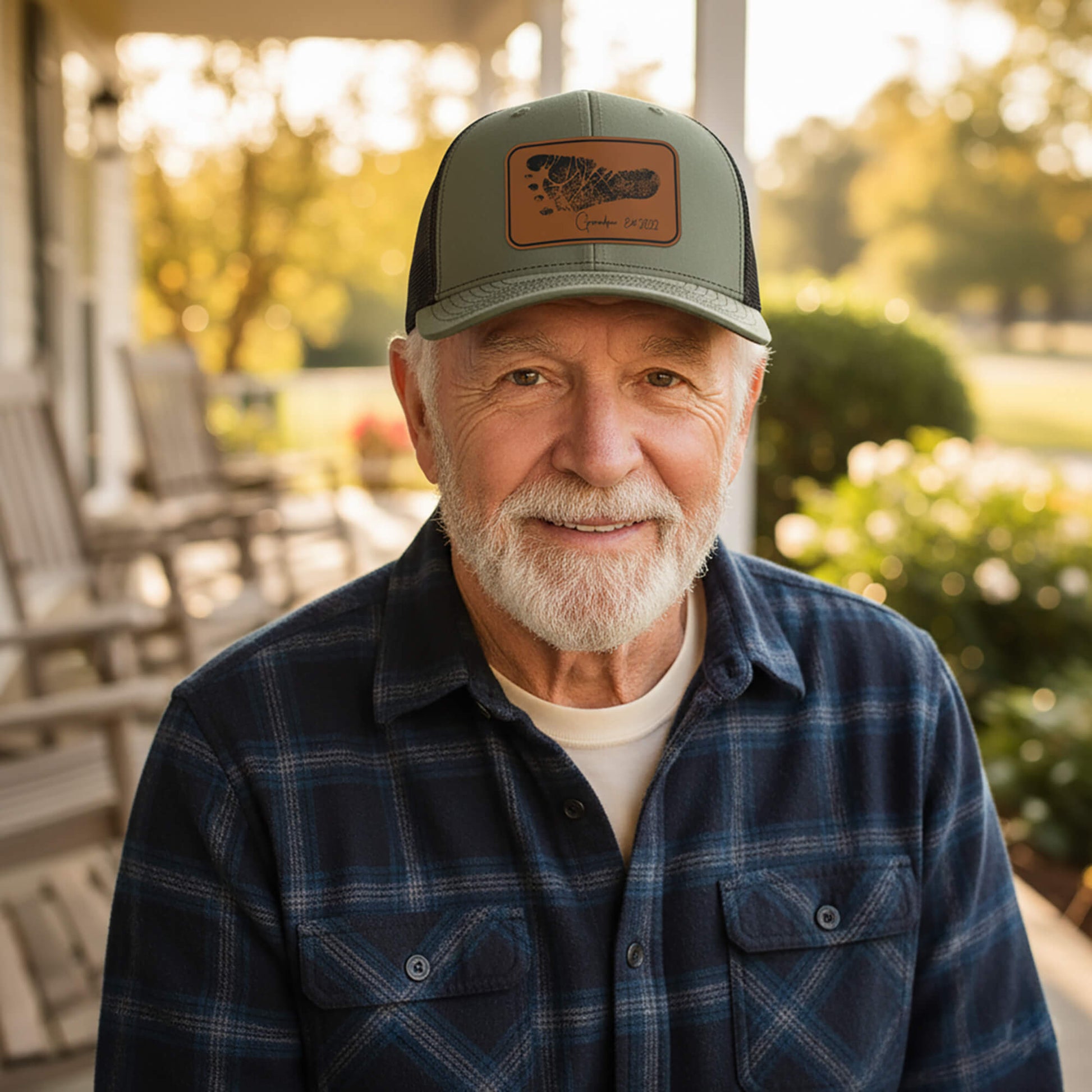 Celebrate life’s most precious moments with a personalized keepsake you can wear every day. Our Custom Engraved Baby Footprint Leather Patch Trucker Hat is the perfect way to carry your little one’s memory close to you. Each hat features your baby’s actual footprints (or handprints) beautifully engraved on a durable leather patch and attached to a high-quality trucker cap.
