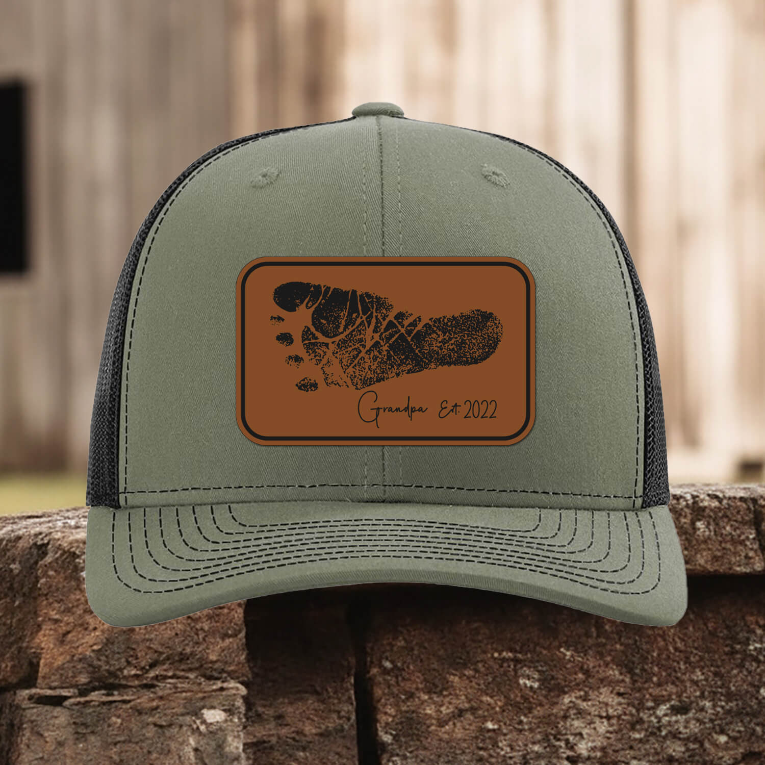 Personalized Baby Footprint Trucker Hat – Custom Engraved Leather Patch Newborn Gift
